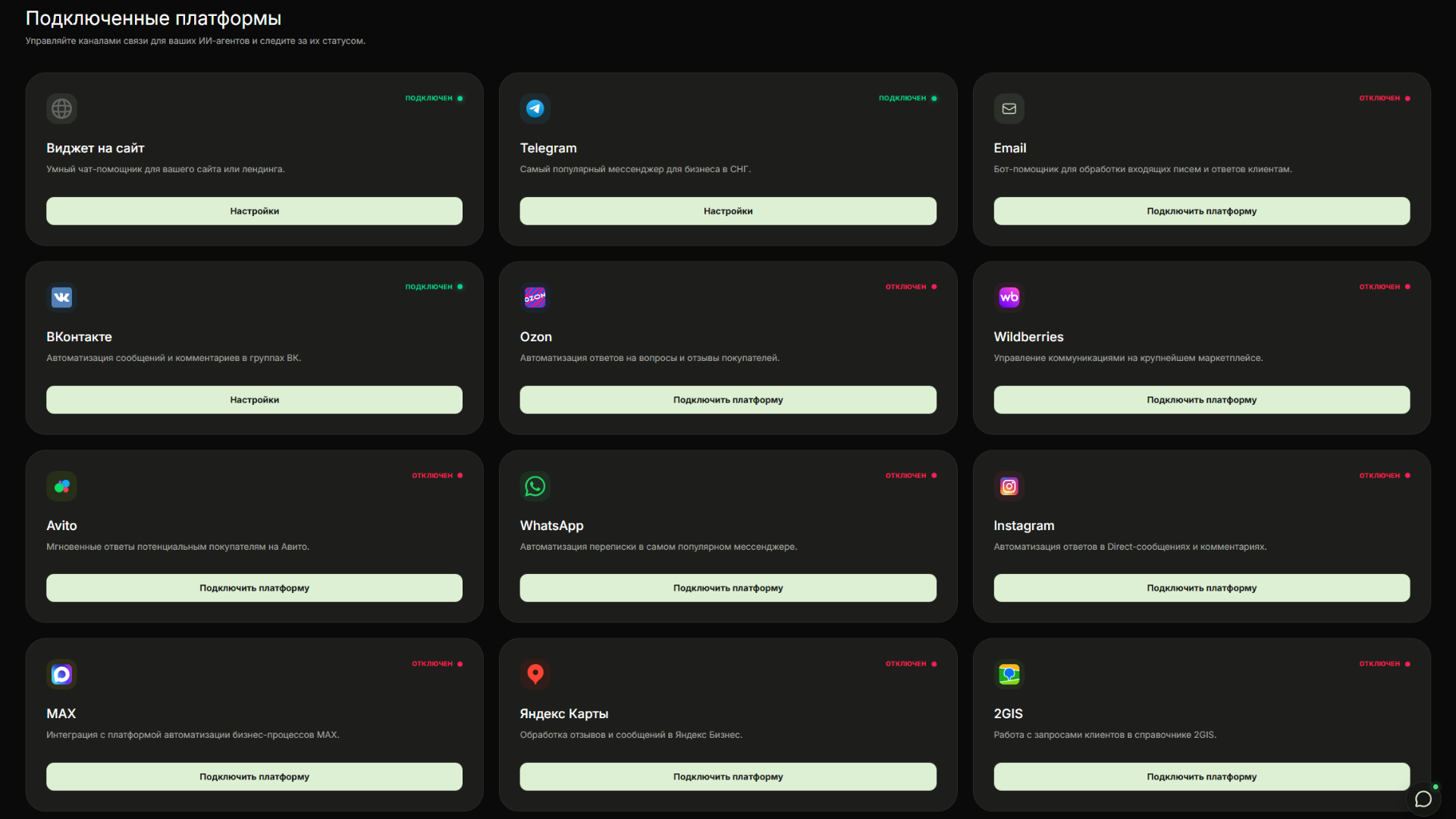 Объедините все каналы коммуникации в одном месте. Интеграция с Telegram, MAX, WhatsApp, Avito, VK и другими площадками происходит в пару кликов без привлечения разработчиков.