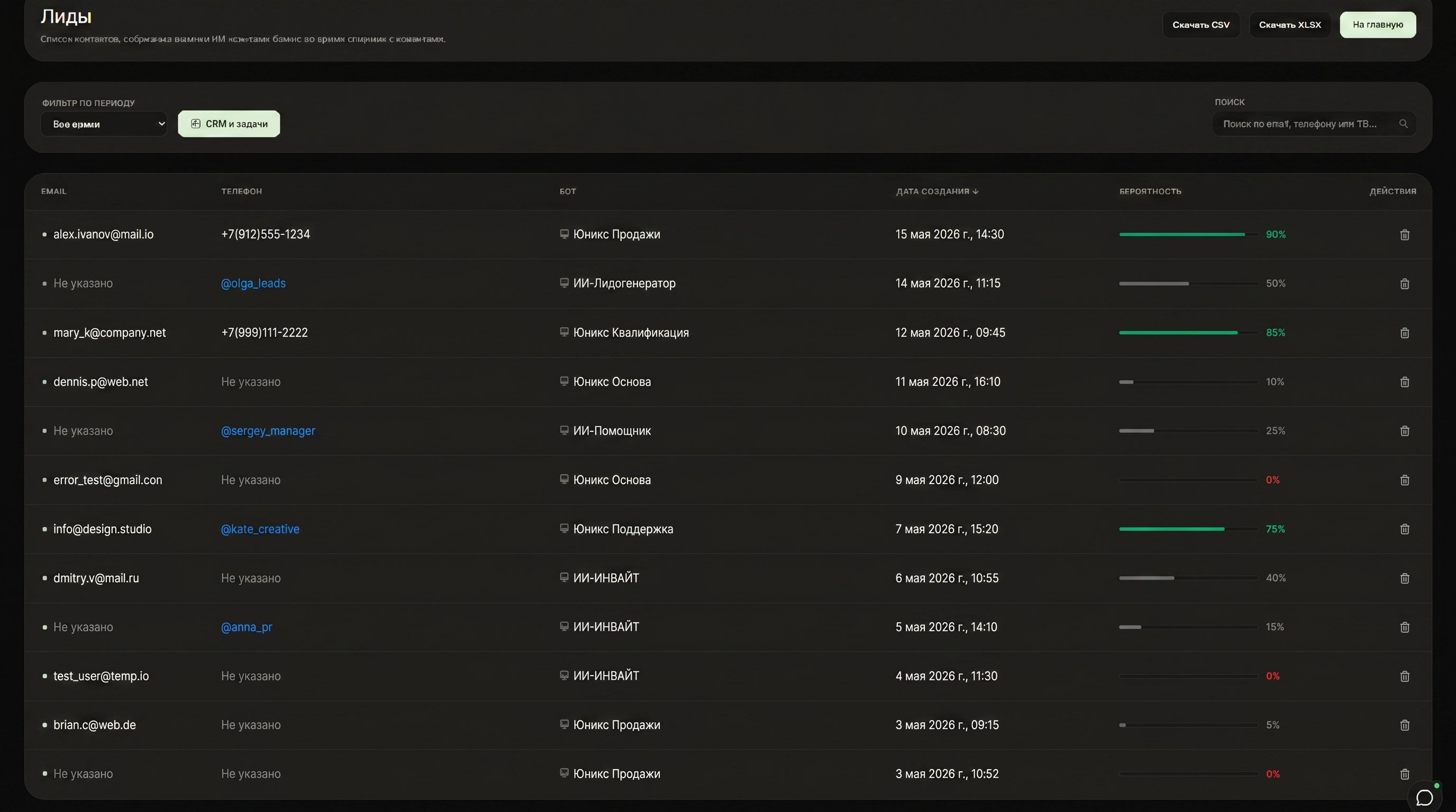 Следите за всеми этапами взаимодействия с клиентами. Бот автоматически собирает данные, квалифицирует лидов и переносит их по воронке.